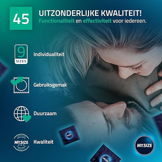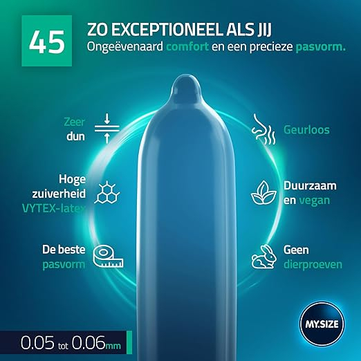 MY.SIZE Pro 45 mm condooms zijn perfect voor mensen die een nauwsluitend rubber nodig hebben, of om te gebruiken met kleinere seksspeeltjes. Deze condooms zijn ontworpen voor mensen met een slanke schacht met een penis omtrek van minimaal 9,5cm en hebben rechte wanden die nauw om de penis passen zonder de beweging te belemmeren. Een kortere lengte van 160mm verhoogt ook het comfort.