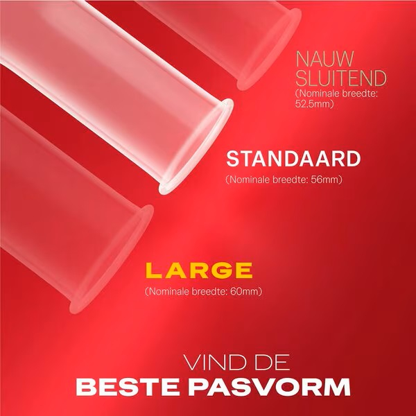 Slechts 0,055 mm dik en toch ongelooflijk sterk, dit is het condoom van de volgende generatie dat maximale intimiteit en ultieme veiligheid biedt. Geschikt voor diegenen die een ruime pasvorm nodig hebben, aangezien deze condooms een nominale breedte van 56 mm hebben.