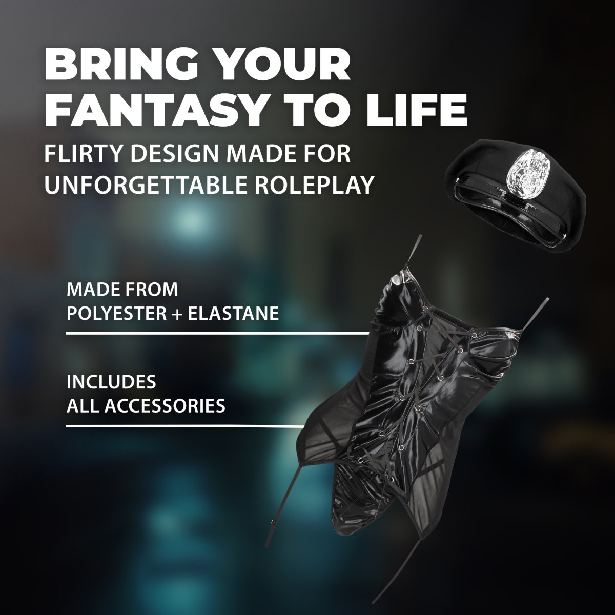 Het kostuum is gemaakt van een zachte en comfortabele stof die soepel om het lichaam valt en prettig aanvoelt op de huid. Dankzij de fijne pasvorm blijf je je vrij bewegen en voel je je zelfverzekerd, zelfs wanneer de spanning oploopt. Perfect voor vrouwen die houden van controle, verleiding en een tikje dominantie.